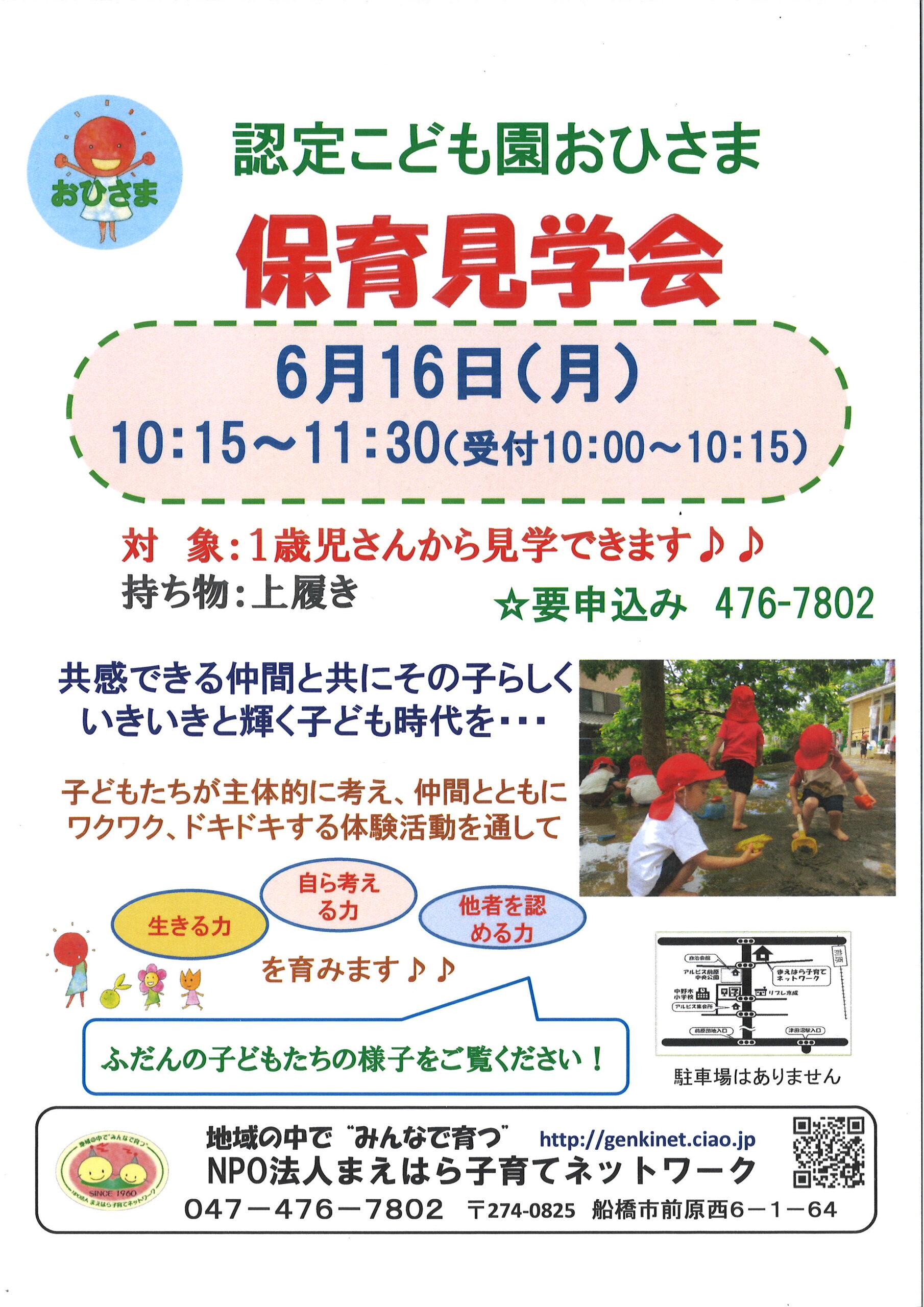 ※終了【認定こども園おひさま】保育見学会のお知らせ 6/16(月)10:15~ 2025 7/16 お知らせ おひさま 保育見学会 2025年5月28日2025年7月16日 6/16(月)に保育見学会を実施します。 お電話での申込みが必要となります。(047-476-7802) 日時 :6/16(月) 10:15~11:30(受付→10:00~10:15) 対象 :1歳児以上 (令和5年4月2日生~) 持ち物:上履き 日常の子どもたちの様子が見学できますので、 ぜひご参加ください! お知らせ おひさま 保育見学会 2025年度のあそびばは4/28(月)からスタートします! ※終了【アトムのへや】くんくんリング砲 6/29(日)9:30~11:30 (電話受付中!)