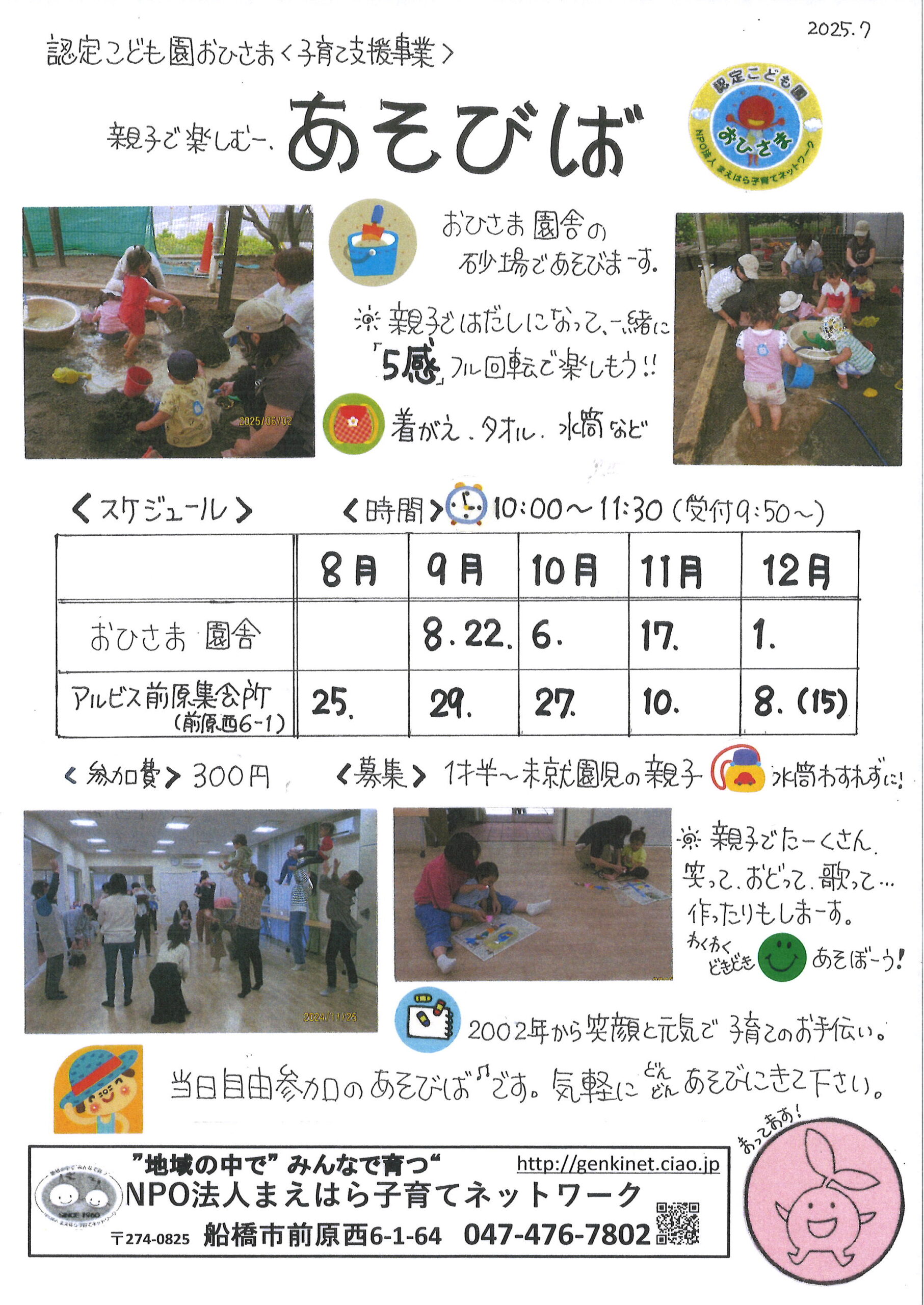 【あそびば】8月以降の日程のお知らせ 2025 8/20 お知らせ おひさま 子育て支援事業 teamてくてく~まちはっけん~ 2025年7月24日2025年8月20日 8月以降のあそびばの日程が決定しましたので お知らせします。 対象年齢:1歳半~未就園の親子 時 間: 10:00~11:30 参加費:300円 当日自由参加OK(お申し込みは不要)です。 お友だちを誘ってぜひ遊びにきてくださいね。 お知らせ おひさま 子育て支援事業 teamてくてく~まちはっけん~ かまどの煙発生のお詫び ※終了 令和8年度 つくしんぼ入園説明会のお知らせ