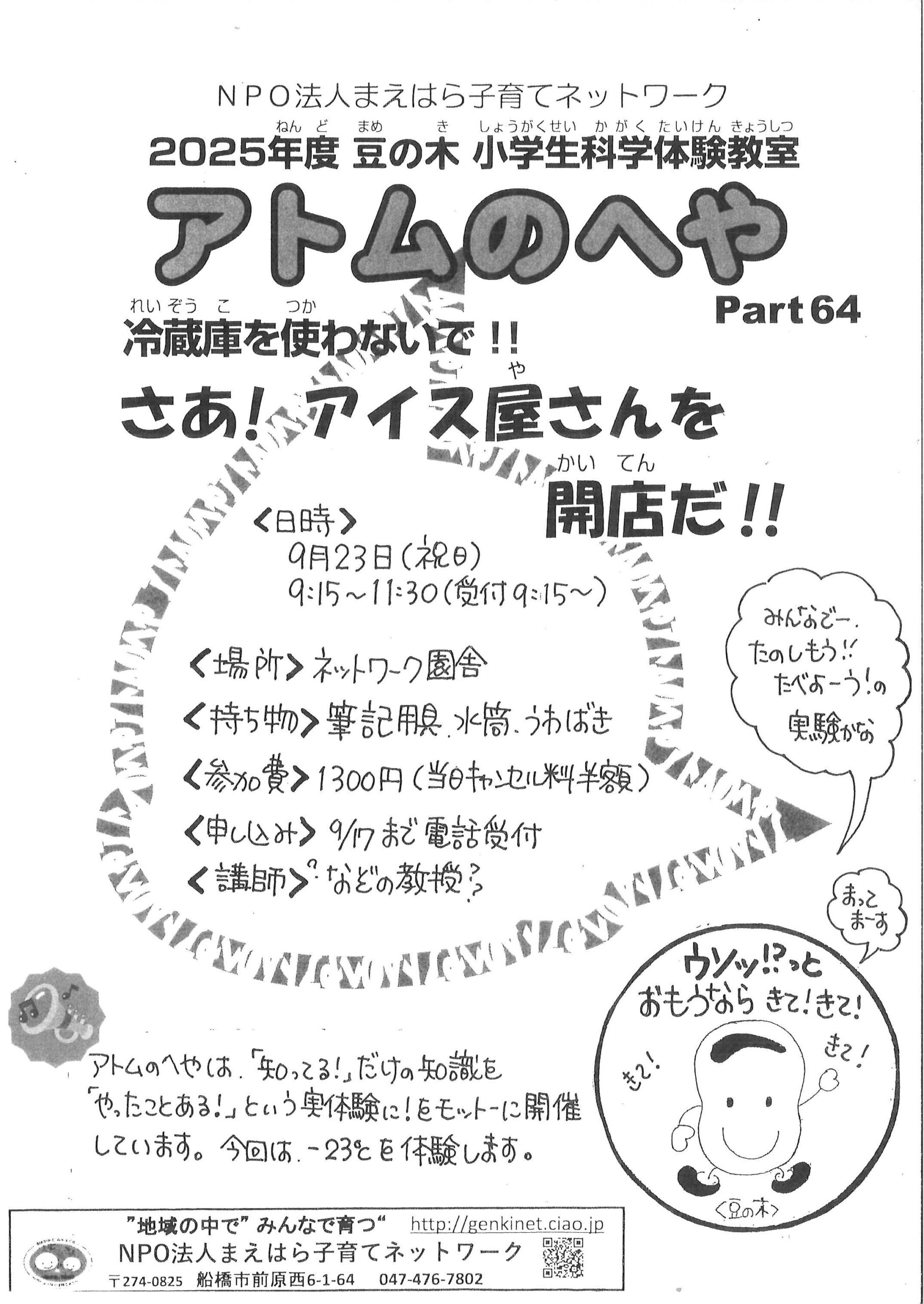 ※終了【アトムのへや】アイス屋さん 9/23(祝)9:15~11:30 (電話受付中!) 2025 9/24 お知らせ おひさま 豆の木 科学体験教室『アトムのへや』 2025年9月3日2025年9月24日 9/23⁽祝⁾にアトムのへやを開催します! ※開催場所は「ネットワーク園舎」です。 お電話にてお申込みください。(047-476-7802) お知らせ おひさま 豆の木 科学体験教室『アトムのへや』 ※終了 令和8年度 認定こども園おひさま入園説明会のお知らせ ※終了 令和8年度認定こども園おひさま入園説明会お申込みフォームのお知らせ