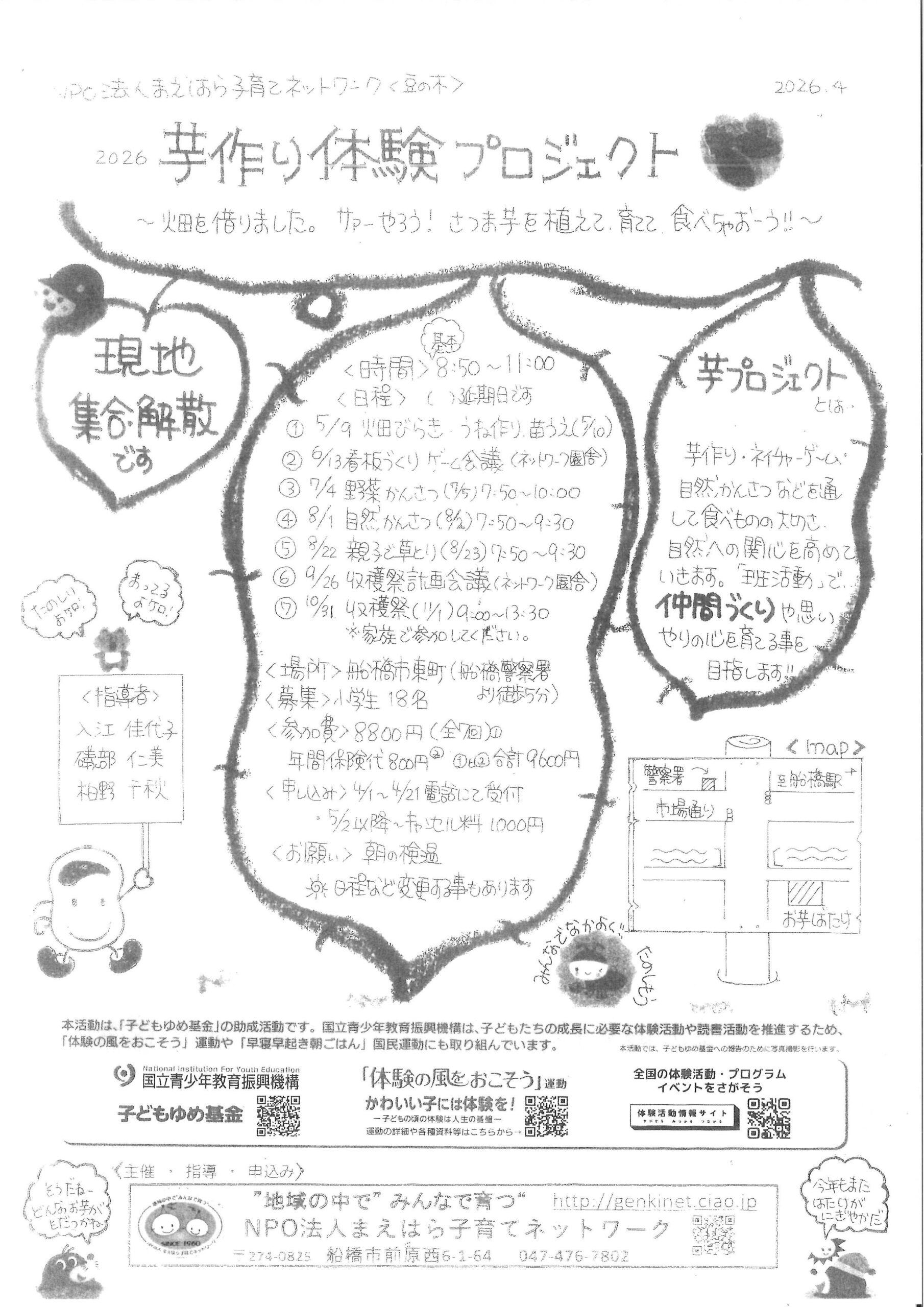 【2026 芋作り体験プロジェクト】参加者募集!(電話受付~4/21) 2026 4/15 お知らせ ネットワーク 豆の木 芋作り体験プロジェクト 2026年4月15日 今年も芋作り体験プロジェクトを開催します。 お友だちを誘って、ぜひ参加してみてくださいね。 お知らせ ネットワーク 豆の木 芋作り体験プロジェクト 【わの学校】ネイチャーゲームがいっぱい4/26(日)(電話受付~4/22)